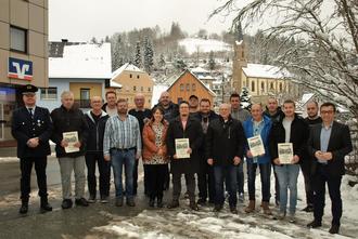 Ehrungen SK Wallenfels: Ehrungen für 10, 20, 25, 30, 40 und 50 Jahre Mitgliedschaft konnte Vorsitzender und Hauptmann Christopher Zeuß (li) durchführen, rechts Bürgermeister Jens Korn.