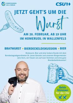 „Jetzt geht´s um die Wurst!“ unter diesem Motto laden die CSU-Ortsverbände Wallenfels und Neuengrün am Donnerstag, 20. Februar, ab 19 Uhr ins Gasthaus Homerudl ein. Das Motto hat an diesem Abend eine doppelte Bedeutung: Zum einen im Hinblick auf die Bundestagswahl. Abgeordneter Jonas Geissler wird zu der anstehenden Richtungsentscheidung Stellung nehmen und bei der „Bierdeckeldiskussion“ auch die Fragen der Teilnehmer beantworten. Der Titel gilt aber auch kulinarisch: Das Homerudl-Team schmeißt den Cutter an und produziert extra frische Bratwürste für den Abend. Und vielleicht verrät Jonas Geissler als Abgeordneter für Coburg und Kronach, ob ihm die Würste aus der Residenzstadt besser schmecken als die aus dem Frankenwald.