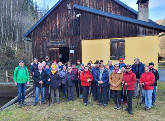 Vor der historischen Hammermühle, die im Jahr 1605 zum ersten Mal urkundlich erwähnt wurde, stellten sich die Teilnehmer zum Foto mit den beiden Wanderführern Jürgen Schlee (vorne links) und Alexander Schlee (hintere Reihe links) auf.
