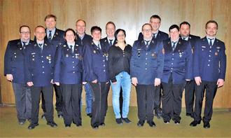 Carolin Wicklein (5.v.li) wurde für 25 aktive Dienst, Uwe Fleischmann (5.v.re) für 40 Jahre aktiven Dienst geehrt, Markus Zeuß (2.v.li) ist seit 30 Jahren aktiv. Mit im Bild die Geehrten für Mitgliedschaft und die Ehrengäste.
