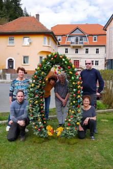 Der Gartenbauverein Wallenfels mit seiner Vorsitzenden Christine Schlee geht in diesem Jahr neu Wege, wenn es heißt, Osterdekorationen und Osterbrunnen aufzustellen. Lange Jahre wurde auf dem Marktplatz ein Osterbrunnen aufgebaut. Doch die Gegebenheiten haben sich seit der Coronapandemie geändert und so beschloss man in diesem Jahr auf Initiative von Rosi Hentschel ein Osterei aufzustellen. Doch das gestaltete sich nicht so ganz einfach. Gut, dass man mit den Firmen in Wallenfels so gut zusammenarbeiten kann. Deshalb bauten Georg und Johannes von der Firma Metallbau Bernard Hofmann ein Gestell aus Metall. Ganz ohne Spezialmaschinen und in Handarbeit gefertigt in zwei Arbeitstagen wurde der Metallostereirahmen ein Unikat. Der Rahmen wurde von der Fa. Hofmann als Spende an den Gartenbauvein übergeben. Die Mitglieder des Gartenbauvereins banden die Girlanden um den Rahmen und schmückten diese mit handgefertigten ausgeblasenen Ostereiern. Hier war man auch einige Stunden im Einsatz.