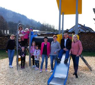 Die Kinder sind begeistert von ihrem neuen Spielgerät und Bürgermeister Jens Korn musste sofort die Rutsche ausprobieren. Annegret Hümmrich-Korn (4.v.re) und ihrer Vorstandschaft wurde herzlich gedankt.