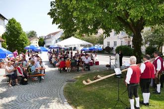 Beim Tag der offenen Türe rund um den Alten Pfarrhof St. Georg hob Bürgermeisterin Renate Deniffel das herausragende Engagement von Kirchenpfleger Wendelin Einsiedler hervor. Die enge und erfolgreiche Zusammenarbeit von Pfarrei und Gemeinde sei maßgeblich von Wendelin Einsiedler geprägt, der als dritter Bürgermeister beides stets im Blick hat. "Wendelin Einsiedler ist ein Macher", so Deniffel. Ihm sei es zu verdanken, dass von den 140.000 € der Umbaukosten rund 60.000 € über Spenden, 20.000 € über die Gemeinde und 15.000 € über die Diözese anteilig mitfinanziert wurden. Die Unterhaltskosten teilen sich die Gemeinde mit 46%, die Pfarrgemeinde mit 42% und der Kindergarten mit 12% auf. So können rund 20 verschiedene Gruppen die Räume nutzen. "Wir sind nicht nur Energie- sondern auch Heimatdorf", brachte es Wendelin Einsiedler auf den Punkt.