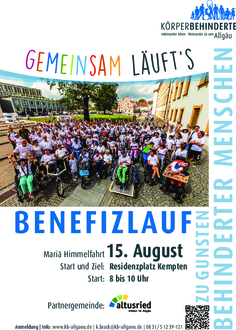 Unter dem Motto „Gemeinsam läuft’s einfach besser“ lädt die Stiftung für Körperbehinderte Allgäu am 15. August zum 16. Allgäuer Benefizlauf ein. Start und Ziel ist der Residenzplatz in Kempten.