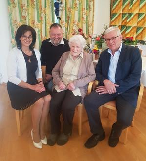 Maria Odendahl an ihrem 105. Geburtstag mit Thomas Eigstler in Vertretung der Landrätin (links), Xaver Wankerl (rechts) vom SSV und Bürgermeisterin Renate Deniffel.
