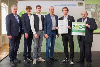 v.l.: Ministerialdirigent Dr. Michael Karrer, Bildungsreferent im bayerischen Landwirtschaftsministerium, die Auszubildenden Marcel Roth und Andreas Kobr, Lars Schellheimer, Geschäftsführer der Schellheimer Garten- und Landschaftsbau GmbH, Ausbilder Jan Schellheimer und Gerhard Zäh, Präsident des VGL Bayern.