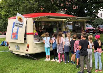 Als besonderes Angebot diesen Sommer steht Julius Müller bei trockenem Wetter immer mittwochs mit seinem Eis- und Mandelwagen im Dorfpark und bietet süße Leckereien für Groß und Klein an.