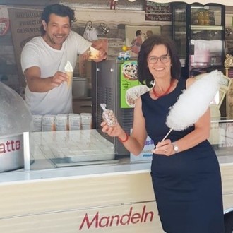 Jedes Schulkind bekommt von Bürgermeisterin Schön einen Gutschein und darf sich über eine kleine Süßigkeit aus dem Mandelwagen von Julius Müller freuen.
