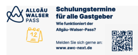 Bitte über nebenstehenden Link zu Schulungen für das neue Allgäu Walser Pass System anmelden und somit immer auf dem aktuellen Stand bei der Betreuung der Gäste in Wildpoldsried bleiben!