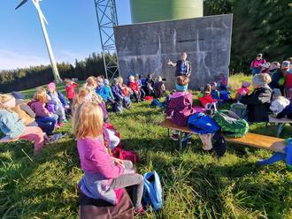 Am Mittwoch, 25. September 2024 unternahm die gesamte Grundschule Wildpoldsried einen Ausflug zur Besichtigung der Windräder in Hutoi. Vor Ort erklärte Herr Wendelin Einsiedler wesentliche Aspekte zum Thema Windenergie und gab einen guten Einblick in diese zukunftsträchtige Technologie, die bereits im Jahr 2000 in Wildpoldsried Einzug gehalten hat. Dabei bezog er die Kinder bewusst ein. Diese hatten sich mit dem Film „Das Energiespardorf - Eine CheXpedition“ mit Checker Julian gut vorbereitet.