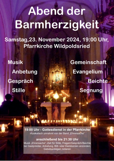 Wir laden Euch herzlich zur nächsten Herz-Jesu-Stunde am Freitag, 8. November 2024, 15:00 Uhr, in die Pfarrkirche St. Georg in Wildpoldsried ein. In einer Andachtsstunde wenden wir uns an das liebende Herz Jesu und übergeben ihm die Sorgen dieser Zeit.