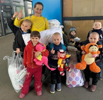 Die Kuscheltiere bringen die Augen der sechs ukrainischen Waisenkinder und ihrer Betreuerin zum Strahlen