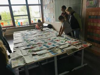 Ein Instrumentenkarussell der Musikkapelle Wildpoldsried mit Vorstellen und Ausprobieren von Instrumenten unter der Leitung von Manuela Eberle konnte besucht werden. Die 1. Klasse präsentierte eine Kunst- und Schreibausstellung und bot im Nebenzimmer Knobeleien an. Ihre Highlight-Spiele aus dem Präventionsprogramm „Eigenständig werden“ stellten die Kinder der 2. Klasse vor und erprobten sie mit den Teilnehmern. Die Challenge der 2. Klasse im Nebenraum bestand darin: Schaffen es die Kinder in 90 Minuten so viele einzelne Hände auf einem Leintuch abzudrucken, wie Schüler in diesem Schuljahr die Grundschule Wildpoldsried besuchen? Es durften immer nur 3 Kinder gleichzeitig in den Raum und die bemalte Hand musste vor dem Verlassen des Raumes von der Farbe gesäubert werden. Es blieb spannend bis zum Schluss. Gleichzeitig durfte in der Turnhalle der Ninja-Parcours der Klasse 3a und im Sinus-Raum die Entdeckerwerkstatt der Klasse 3b erprobt werden. Die 4. Klasse bot im Klassenzimmer Action Painting und davor einen Plant-for-the-Planet Schokoladenverkauf an.