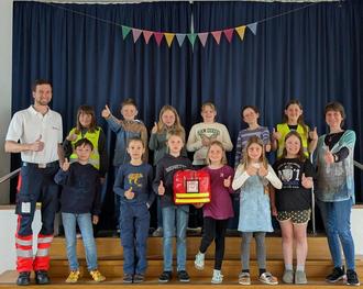 Am 02.04.2025 haben 12 SchülerInnen der Grundschule Wildpoldsried ihre Erste-Hilfe-Ausbildung bei den Maltesern abgeschlossen und dürfen sich nun "miniRETTER" nennen. In insgesamt acht Unterrichtseinheiten haben die Kinder gelernt, was helfen heißt, wie man Hilfe holt, was zu tun ist, wenn jemand bewusstlos ist und wie man kleine und große Verletzungen versorgt.