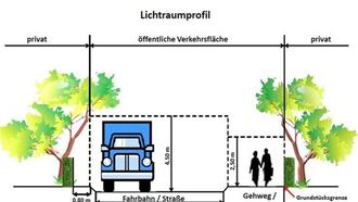 Über Fahrbahnen ist der Luftraum bis zu einer Höhe von 4,50 m und über Gehwegen bis mindestens 2,50 m von Ästen und Zweigen freizuhalten. Entlang von Gehwegen ist der Bewuchs bis hinter die Gehwegkante zurückzuschneiden. Bei Fahrbahnen muss der Abstand zur Fahrbahnkante mindestens 0,75 m betragen. Die Verpflichtung zum Freischneiden gilt auch für Straßenlampen und Verkehrszeichen.