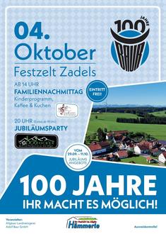 Unter dem Motto „100 Jahre – Ihr macht es möglich!“ lädt die Metzgerei Baur alle herzlich am Samstag, 04. Oktober ins Festzelt nach Zadels ein.
