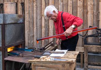 Rudolf Frey zeigt den Museumsbesuchern, wie man einen Glasstab zum Schmelzen bringt und aus dem über 900° C heißen Glas mit einer Zange verschiedenste Formen presst. Bei schlechtem Wetter muss die Vorführung ausfallen.