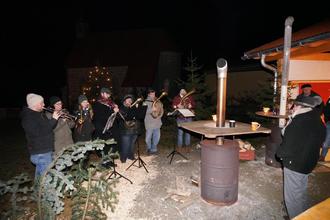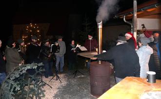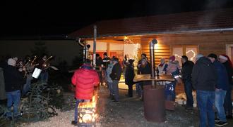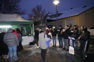 Sabine Dewald, Renate Voith, Josef Pflaum sen., Johannes Pflaum, Jonas Kraus, der direkt nebenan im alten Schulhaus residiert und Feuerwehrchef Thomas Schwab spielten mit ihren Blasinstrumenten an diesem Abend adventliche Weisen.