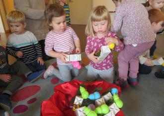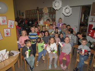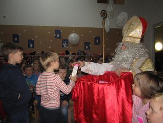 Zur großen Freude für die Kinder hat der Nikolaus, nach seinen lobenden und auch mahnenden Worten, für jedes der Kinder ein kleines Geschenk in Form eines Schoko-Nikolauses und eines Schneeballformers dabei. Dieses wurden auch in diesem Jahr wieder von Pfarrer Norbert Götz und dem Elternbeirat organisiert. Mit dem Lied „Lasst uns froh und munter sein“ wurde der Nikolaus verabschiedet.