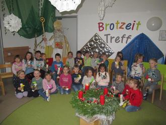Er zog weiter zu den Kindergartenkindern. Zu den Klängen von „Öffne doch dem Nikolaus die Tür“ nahmen die Kinder der Roten, Blauen und Gelben Gruppe den Hl. Niklaus in ihrem großen Adventskreis in Empfang. Nach dem die Leitung der Kindertagesstätte, Sonja Kick, den Nikolaus begrüßt hatte, sangen alle gemeinsam das Lied „Eine stille Zeit“. Die Blaue Gruppe sang anschließend „Heute kommst du, Nikolaus“. Von der Roten Gruppe gab es dann noch „Und wieder brennt die Kerze“ zu hören. Sonja Kick begleitete die Lieder mit der Zither, Martina Lorenz unterstützte mit dem Akkordeon. Die Gelbe Gruppe rundete den Besuch mit dem Bewegungsgedicht „Holler, boller Rumpelsack“ ab.