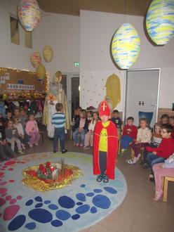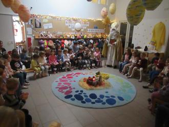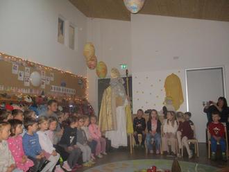 Die Kinder der Roten Gruppe begrüßten ihn mit dem fröhlichen Lied "Wieder geht der Nikolaus", und füllten damit den Raum mit einer warmen Atmosphäre.