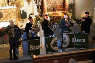 Festliche, musikalische Akzente setzte zudem die Bläsergruppe „Bocklblech“ aus Waidhaus mit Tobias Fürtsch (Tuba), Ludwig Greß (Tenorhorn), Jonas Schmid (Tenorhorn), Thomas Bayer (Trompete) und Philipp Bauriedl (Steirische Harmonika und Posaune). Die fünf jungen Männer aus dem Grenzland erfüllten die Kirche mit ihren kräftigen, aber warmen Bläserklängen und der „Quetschn“ von Philipp Bauriedl. Mit Stücken wie „Sol Invictus“, „Advent ist ein Leuchten“ und „Trag mi Wind“ war böhmisches Flair zu hören. Bauriedl begleitete außerdem „TriAngel“ auf der Steirischen Harmonika. Ein besonderer Höhepunkt war das kraftvoll interpretierte „The Power of Love“ (Original von Jennifer Rush, 1984), mit dem die Bläsergruppe die Zuhörer noch einmal intensiv berührte.