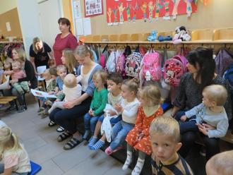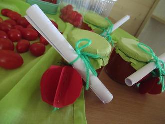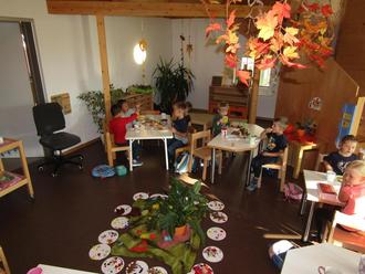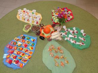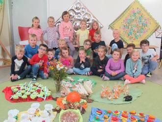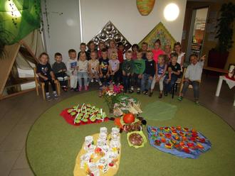 Mit verschiedenen Liedern der blauen und roten Gruppe und einem Gebet der gelben Gruppe wurde die Feier umrahmt. Bei der Erzählrunde hat jede Gruppe ihre Gaben vorgestellt. So gibt es in der roten Gruppe selbstgemachtes Ketchup, in der blauen Gruppe ein Blatt aus Modelliermasse, welches als Schale für eine kleine Paprikaschote diente. Die Kinder der gelben Gruppe haben ein Erntedank-Windlicht gestaltet und in den Krippengruppen gab es Apfelchips und Kekse in Blätterform.