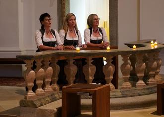 A Cappella beginnt TriAngel (von links: Andrea Götz, Steffi Daubenmerkl und Doris Völkl) den Abend knieend am Altar mit dem „Da knie ich Maria“ und öffneten dabei sogleich die Tür zu einer besinnlichen und gefühlvollen Stunde.