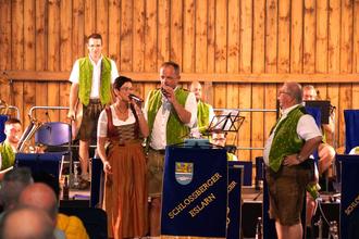 Mit dabei, auch der Waldthurner Trompeter Felix Griesbach, der seit Jahresbeginn fest im Ensemble dabei ist. Die Eslarner boten ein Mix aus ihrem „Ernst-Mosch-Gedächtnis-Konzert“ und dem Bierzeltprogramm, was das anwesende Fachpublikum mit viel Applaus und Begeisterung honorierte. Nachdem die Abendmesse in der Dorfkapelle zu Ende war, legten die Musikerinnen und Musiker mit dem Olympiade – Marsch los. Beim Solo-Trommler-Marsch trommelten Stefan Dietl, Thomas Brenner und Thomas Grießl was das Zeug hielt, die Zuhörer trommelten begeistert mit den Füßen auf den Stodlboden. Ein französischer Koch zeigte das kabarettistische Vermögen der Schlossberger bei der Löffelpolka. Nicht fehlen durfte die Paula – Polka für alle Paulas in der Wilhelm – Musik - Arena und im Dorf sowie der Bayerische Defiliermarsch. Böhmische Liebe zog durch die Reihen und für ein anwesendes Geburtstagskind wurde musikalisch „eine weiße Rose“ der Kastelruther Spatzen überreicht. Nach mehr als zwei Stunden Egerländer Musik und mehr ging bei der Schlussankündigung, dass man mit „Bis bald auf Wiedersehn“ ein enttäuschendes „Ohhhh“ durch die Reihen, die Eslarner ließen sich aber nicht lumpen und legten mit der Vogelwiese, den unvermeidlichen Böhmischen Traum und „Mein Tiroler Land“ noch eine musikalische Schippe auf den gelungenen LandKULTUR – Abend drauf.