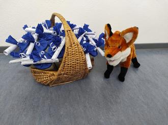 In den Räumen der Wolfgang-Caspar-Printz Grundschule übergab sie an die Mädchen und Buben der 1. Klasse zusammen mit den Büchereifuchs im Beisein der Klassenlehrerin Silke Forster für jede Schülerin und Schüler eine kleine Schultüte.