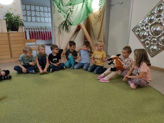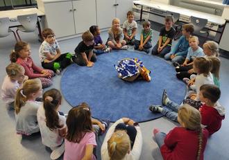 Sichtlich Spaß hatten die Vorschulkinder, als sie der Büchereifuchs – eine beliebte Plüschfigur der bei Vorlesestunden eingesetzt wird – auch hier exklusiv aufmarschierte, jeder durfte ihn natürlich streicheln.