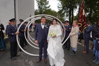 Nach der kirchlichen Trauung stand die Feuerwehr Lennesrieth schneidig vor dem Kirchenportal, das Paar erledigte trotz windigen Wetters den gestellten Auftrag mit einer kleinen Löschspritze sehr souverän und zielsicher.