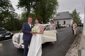 Anschließend ging es im weißen Barockengel des Bräutigams mit Firmpatenkind Jonas Feiler am Steuer zur Feier in die Stadthalle nach Vohenstrauß, zu dem Ort, in dem das Paar auch wohnt.