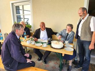 Für ihre Geburtstagsgäste Pfarrer Norbert Götz (links) und Bürgermeister Josef Beimler (Mitte) schneidet Maria Beierl im Beisein von Sohn Ludwig (rechts) ihre selbstgebackene Geburtstagstorte an.