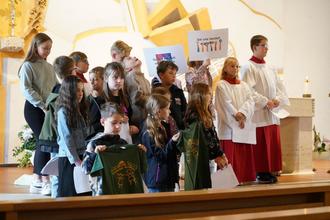 „Alte Hasen“ wie Pfarrer Norbert Götz die Kinder aus den anderen Klassen nannte, begrüßten ihre neuen „Kolleginnen und Kollegen“ gesanglich und mit Gedichten.