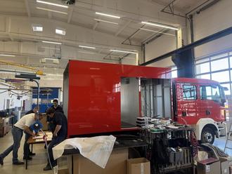 Zur Besprechung der letzten Details und Endmontage bei der Aufbaufirma Brandschutztechnik Görlitz (BTG), trafen sich Michael und Florian Stahl, Stefan und Norbert Riedl, Johannes Weig, Georg Wittmann und Roman Bauer mit dem Projektleiter und dortigen Ansprechpartner, Dipl. Ingenieur Tom Kudßus.
