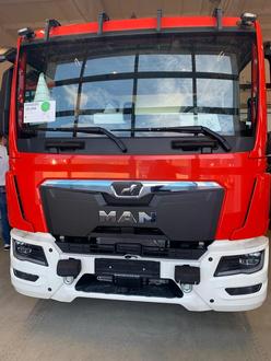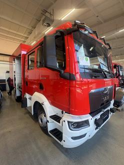 Das Fahrzeug vom Typ MAN TGL 8.220 mit Kofferaufbau stand bereits in der großen Werkhalle. Das jetzige Tragkraftspritzenfahrzeug, mittlerweile mehr als 35 Jahre im Einsatz, wird durch ein modernes Tragkraftspritzenfahrzeug-Logistik ersetzt. Es handelt sich um ein 220 PS starkes Fahrzeug, in dem drei Rollcontainer Platz finden. Zur normalen feuerwehrtechnischen Beladung mit Pumpe TS 8, wird ein Notstromaggregat mit Lichtsäule integriert. Auf Öl- und Unwetterschäden kann künftig sofort reagiert werden.