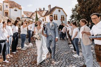 Seine Fußballerfreunde waren ebenfalls aufmarschiert und bildeten ein festliches Spalier. Mit strahlenden Gesichtern gratulierten sie dem Brautpaar herzlich und sorgten für eine sportliche Überraschung: Vor einem kleinen Tor mussten die Frischvermählten ihre Treffsicherheit beweisen.