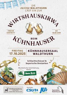 Die CSU und JU Waldthurn laden die Bevölkerung herzlich zur ersten Wirtshauskirwa ein, die am Freitag, den 17. Oktober 2025, ab 18 Uhr in der Gaststätte Kühnhauser stattfindet.