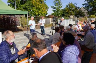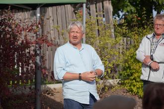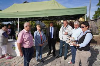 Bei der 5-Jahresfeier erläutert der ehrenamtliche Gänsbürgerladen - Geschäftsführer Michael Steiner (links stehend) die Erfolgsgeschichte des Waldthurner Marktladens.