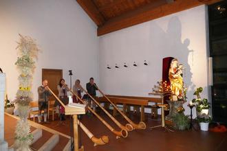 Trotz der vier mächtigen Alphörner mit ihrem klang- und gefühlvollen Tönen schwappte eine gewisse Ruhe auf die Zuhörer, im mit stimmungsvollen Licht getauchten Gotteshaus, über.
