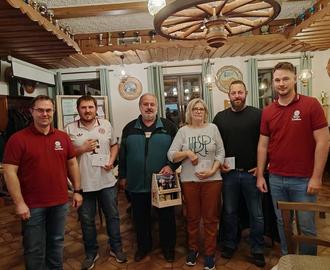 Nach zwei Spielrunden gab Wittmann die Platzierungen bekannt. Bester Kartenspieler an diesem Abend war Swen Reber aus Floß. Mit 137 Punkten sicherte er sich die 300 Euro Preisgeld. Den zweiten Platz belegte Gabi Messer aus Vohenstrauß mit 124 Punkten und erhielt dafür 150 Euro vor dem drittplatzierten Dominik Eiser aus Waldthurn mit 123 Punkten, der 75 Euro mit nach Hause nahm. Der Trostpreis ging an Michael Bugera aus Kümmersbruck. Mit 30 Punkten landete er auf dem letzten Platz. Auf mehreren Tischen hatten die Club-Fans Sachpreise aufgebaut und die Teilnehmer durften sich der Reihe nach einen Preis aussuchen; keiner ging dabei leer aus. Die Bewirtung übernahm der Schützenverein Waldthurn, dem besonderer Dank galt, ebenso der Geschäftswelt für die bereitgestellten Preise.