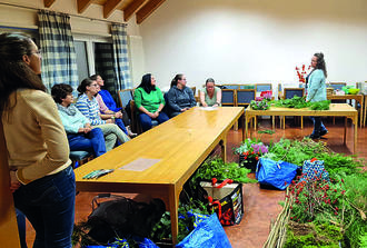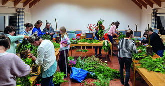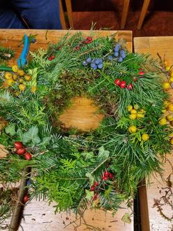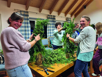 Der Dorftreff verwandelte sich in eine duftende Werkstatt, in der vor allem verschiedene Nadelbaumzweige (wie Tanne und Fichte) sowie weiteres Grünzeug und Naturdekorationen zum Einsatz kamen.