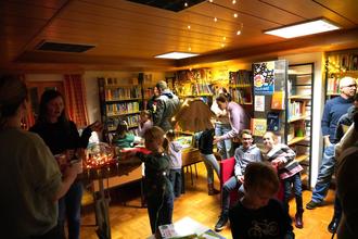 Richtig kuschelig machten sich die Lesefans jeglichen Alters daran, in gemütlicher Atmosphäre bei diesem „Offenen Büchereiabend bei Kerzenschein, Glühwein und Knabbereien“ sich über neue Bücher und Tonies zu informieren. In so manchen Kuschelecken hatten es sich junge Leseratten gemütlich gemacht und zwischendrin klingelte es gemütlich beim „Halli Galli – Spiel“, was dem Abend noch einen besonderen Flair gab.