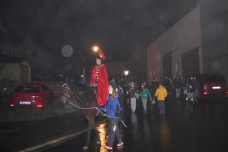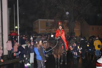 Die elfjährige Traberstute „Lady Toskana“ trug so wie im letzten Jahr auch diesmal den Heiligen St. Martin souverän von der Pfarrkirche St. Sebastian vorbei am Gänsbürgerladen auf der Schulstraße entlang zur Kindertagesstätte St. Josef. Live konnten die Beteiligten erleben, dass man nicht nur den Mantel, wie der Heilige Martin, sondern auch in dieser Hinsicht den Regenschirm „teilen“ konnte, um so manchen regenschirmlosen Besucher der Martinsfeier Unterschlupf zu bieten.