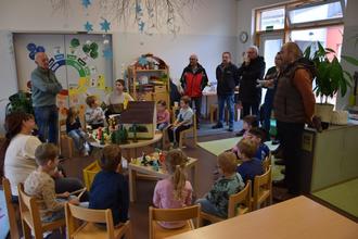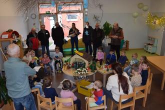 In der Gelben Gruppe der Tagesstätte saßen die Kinder bereits erwartungsvoll im Kreis – von ihren Erzieherinnen Theresa Betz und Tanja Pflaum war ihnen nämlich eine Überraschung angekündigt worden. Das Krippenhaus wurde in die Mitte gestellt und Erwin Klotz begann die gelbe Kiste auszupacken.