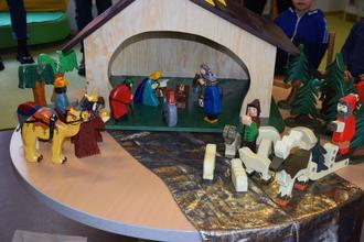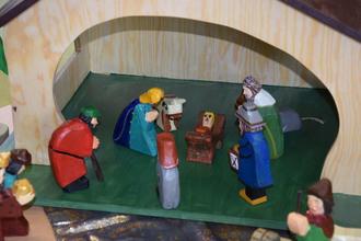 Die Augen der Kinder wurden immer größer, als er Maria und Josef, das Jesuskind, Hirten, Bäume, ein Kamel, einen Elefanten, Ochs und Esel und sogar eine ganze Schafherde auf dem kleinen Tisch aufstellte. Immer wieder griff er in die Kiste und holte Figur um Figur heraus. Und, als ob das noch nicht genug gewesen wäre, hatten die Schnitzer auch noch andere Tiere mitgebracht.