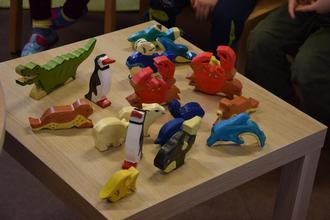 Passend zum Jahresthema „Wasser“ der Einrichtung hatten die Hobbykünstler verschiedene Fische, Krebse, Pinguine und sogar Eisbären angefertigt. Alle Figuren sind mit vielen Details ausgestattet, liebevoll bemalt und durch ihre Größe gut für Kinderhände geeignet. „Wir haben beispielsweise die Gesichter herausgearbeitet, bei maschinengefertigten Figuren sind sie oft nur aufgemalt“, erklärte Klotz, dem solche Figuren ein Gräuel sind. Er dankte in diesem Zusammenhang auch Sigi Beimler, der das Holz gesägt, und Alois Bäumler, der die Stücke glatt gehobelt hat.