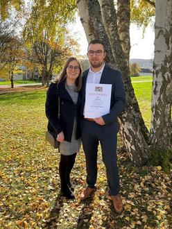 Stolz präsentiert Tobias Ott nach der Übergabe die Forstwirt – Meisterurkunde. Mit im Bild: Freundin Franziska Beer