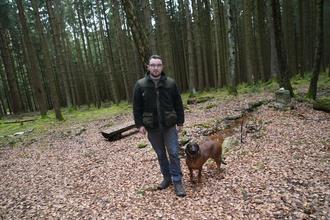 Tobias Ott im Wald mit Jagdhündin Luna bei der Luhequelle unterwegs unterwegs